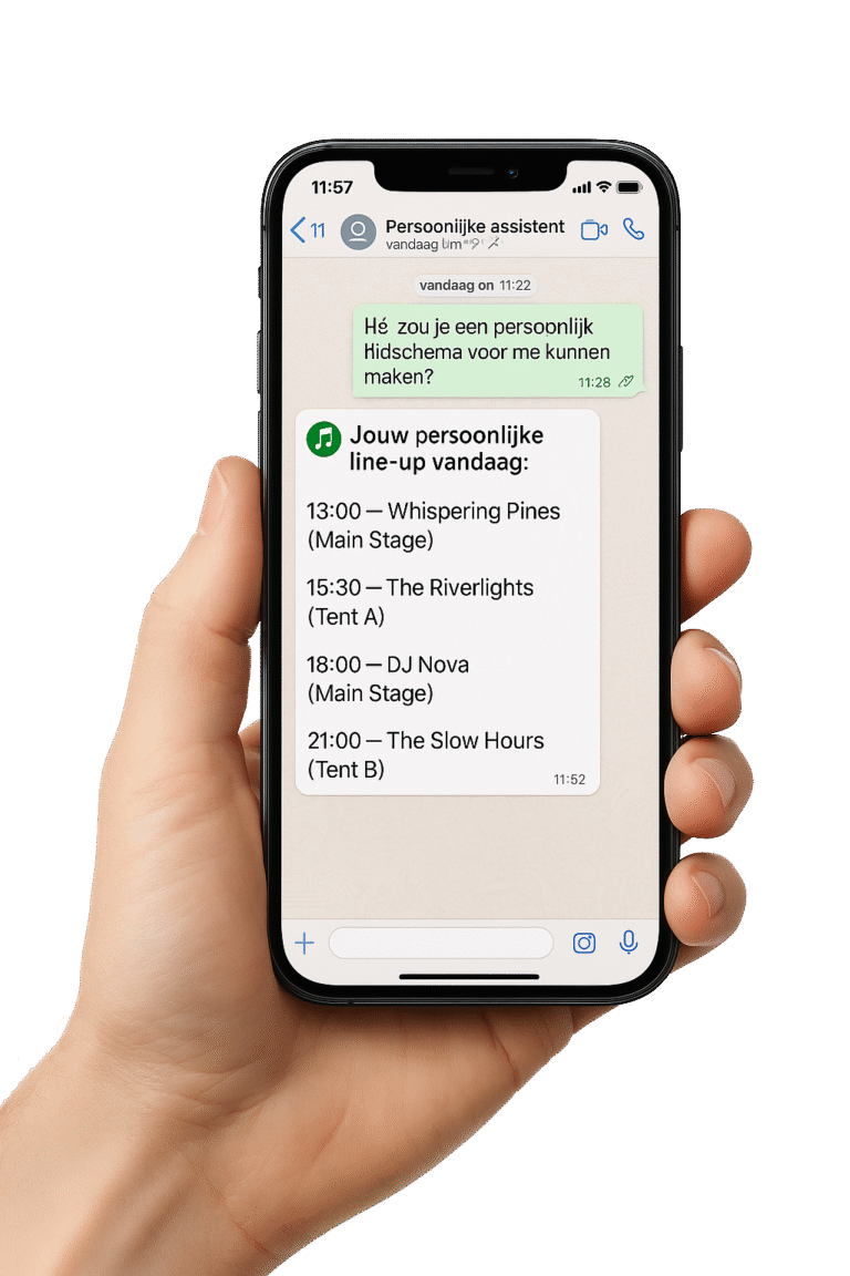 Wij maken het organiseren, managen en beleven van evenementen eenvoudiger, slimmer en persoonlijker. Ons platform stroomlijnt communicatie tussen organisatoren, leveranciers, artiesten en bezoekers — van voorbereiding tot aftermovie. Geen losse e-mails of versnipperde tools meer: met Whave (WhatsApp Voor Evenementen) komt alles samen in één overzichtelijke flow. Van persoonlijke agenda’s en live-updates tot FAQ’s en feedback — Whave zorgt voor persoonlijke communicatie op schaal, via een kanaal waar iedereen al is: WhatsApp.